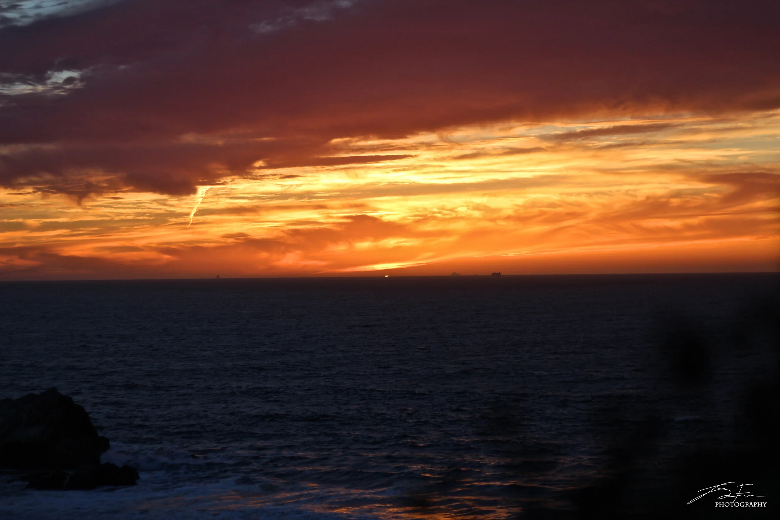 In the area on the hill between the Cliff House and Sutro Heights Park and hovering over the Sutro Bath Ruins lays Lands End Lookout. This is a space where you can sit, think, meditate or stare at the view and feel like you are the only person on earth. The view, the sounds, the smells will engulf your spirit. Even when the sky is covered with a thick layer of gray fog, you can be mesmerized by the sights and sounds of the waves crashing against the rocks. And, if you are lucky enough to show up at sunset on a clear evening, THIS is what you might see...
