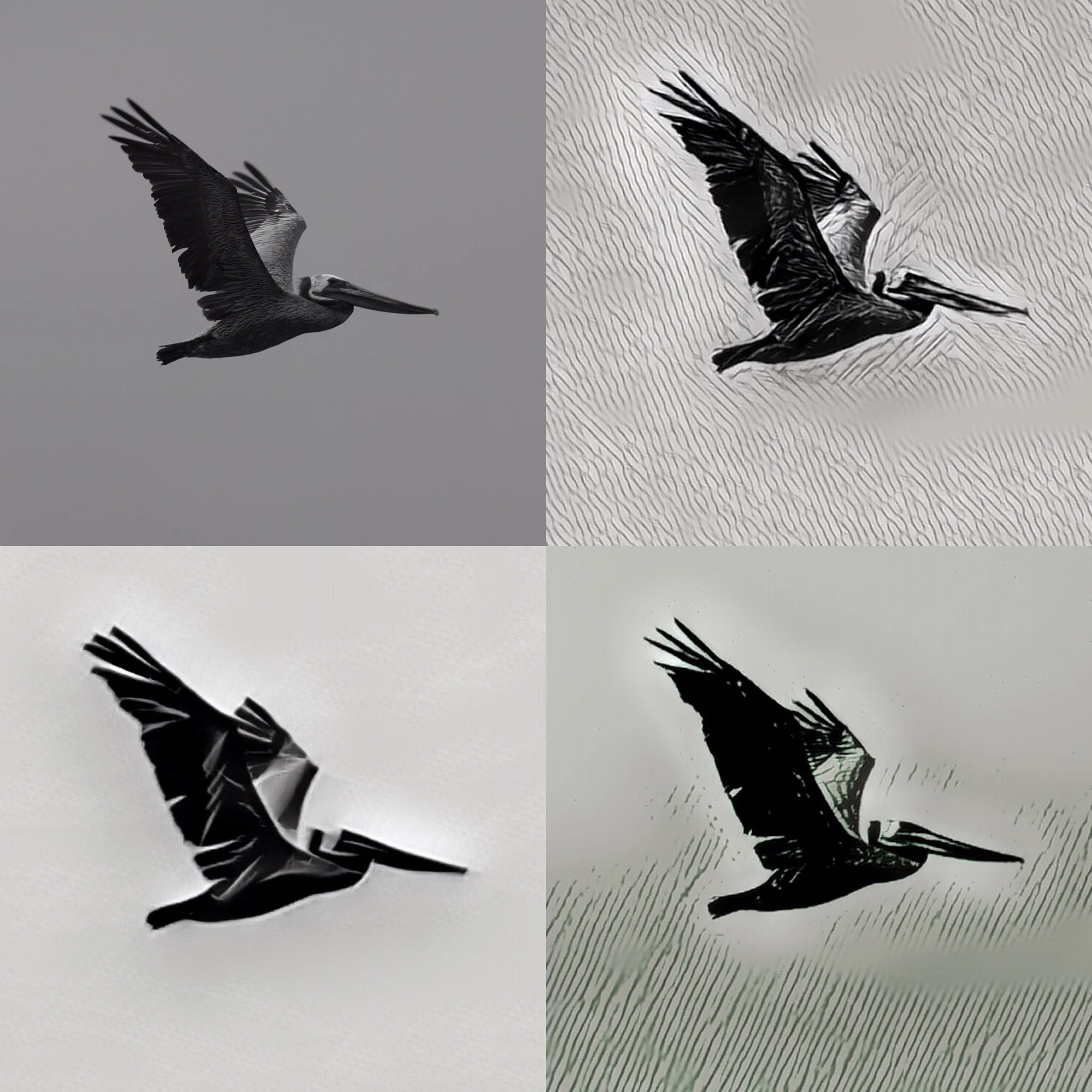 Pelicans galore! Snapped a shot of this guy soaring through the sky on a foggy day at Ocean Beach. The top left is the original. Gotta love what filters can do!