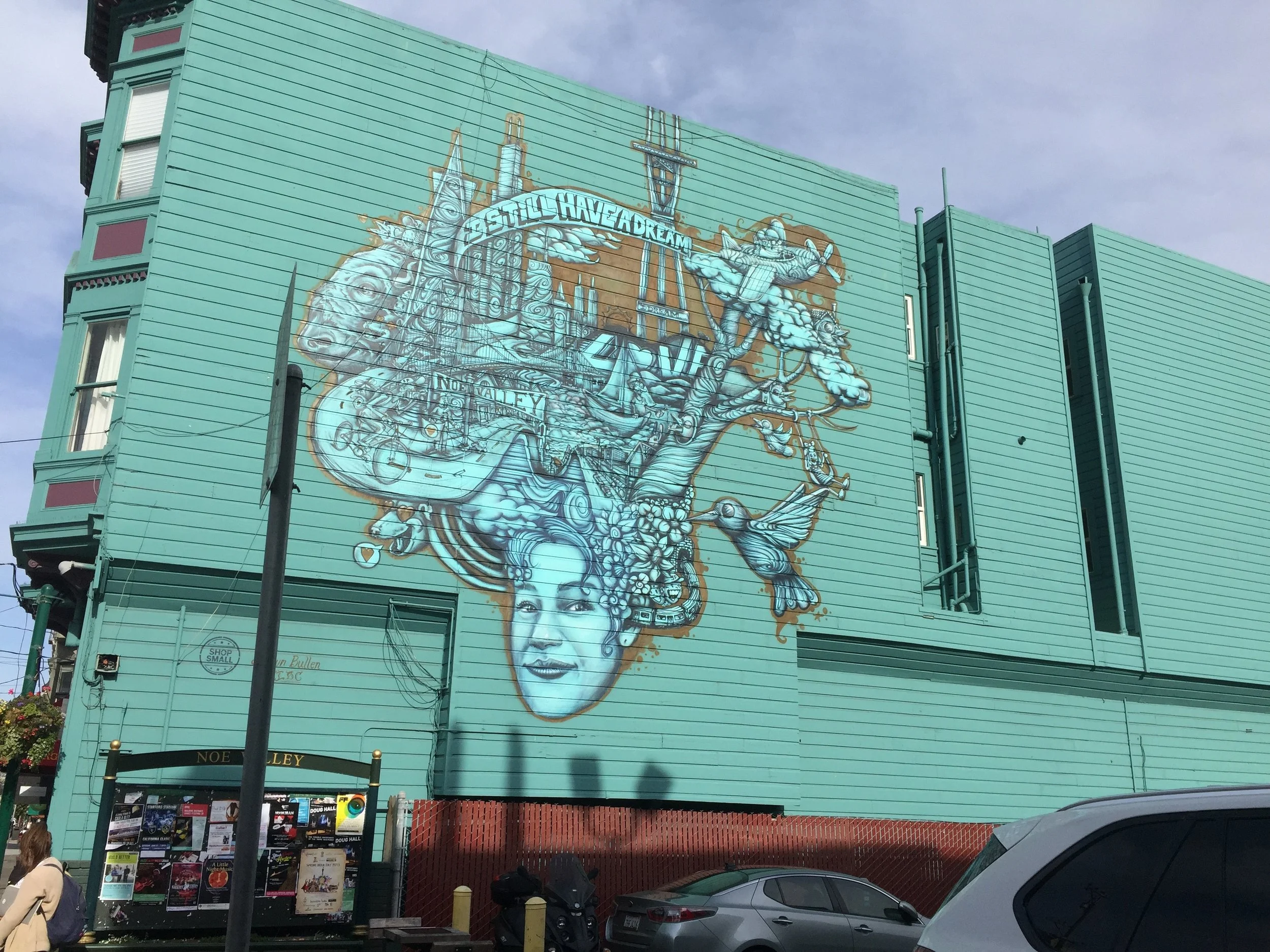 Painted by Shawn Bullen, the mural encompasses the whimsical feeling of both San Francisco and the neighborhood of Noe Valley. This mural has so many parts, including Sutro Tower, the Transamerica Pyramid, The Golden Gate Bridge, a buffalo, a humming bird and the word LOVE to name a few. My suggestion, grab a coffee from Starbucks or a pastry from the near by Noe Valley Bakery, sit on the bench at the parking lot and get lost in the various components of the mural’s “dream”